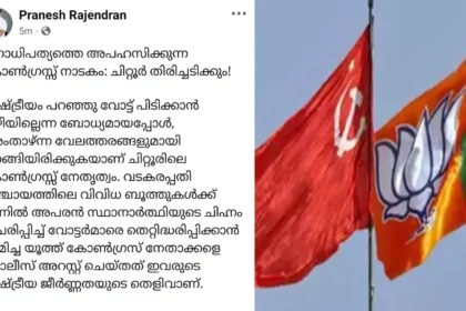 പാലക്കാട് : ചിറ്റൂർ മണ്ഡലത്തിൽ എൽഡിഎഫ് സ്ഥാനാർഥിക്ക് വേണ്ടി വോട്ട് അഭ്യർത്ഥിച്ച് എൻഡിഎ സ്ഥാനാർത്ഥിയുടെ ഫേസ്ബുക്ക്…