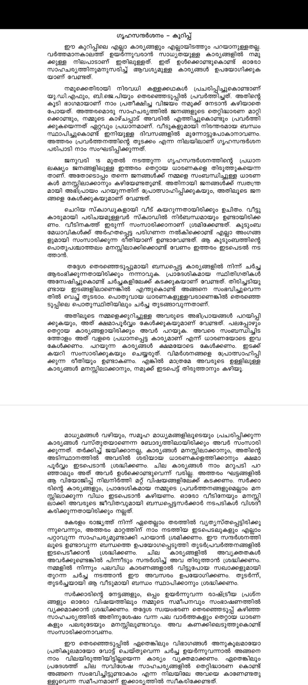 ക്രിസ്ത്യൻ ന്യൂനപക്ഷങ്ങളുടെ പ്രശ്നങ്ങൾ പഠിച്ച ജസ്റ്റിസ് ജെ ബി കമ്മിഷൻ റിപ്പോർട്ടിൽ ഫെബ്രുവരി 6ന് മുഖ്യമന്ത്രി സംഘടന പ്രതിനിധികളുമായി ചർച്ച നടത്തുമെന്നും റിപ്പോർട്ടും നടപടികളും മന്ത്രിസഭ അംഗീകരിച്ച ശേഷം പ്രസിദ്ധീകരിക്കുമെന്ന് ക്രൈസ്തവ ഭവനങ്ങളിൽ പറയണമെന്നും സർക്കുലർ നിർദ്ദേശമുണ്ട്. ഇതിനൊക്കെ പുറമേ വീടുകൾ കയറുമ്പോൾ മുഖ്യമന്ത്രിയെ പുകഴ്ത്തി പറയണമെന്ന് പ്രത്യേകം നിർദ്ദേശിക്കുന്നു.
