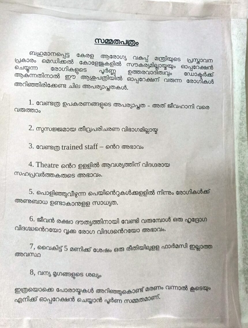 ഇത്രയും വലിയ പരിമിതികൾ അറിഞ്ഞുകൊണ്ട് മരണം സംഭവിച്ചാൽ പോലും സമ്മതമാണെന്ന് രോഗി എഴുതി ഒപ്പിട്ടു നൽകണമെന്നാണ് നോട്ടീസിലെ വിചിത്രമായ ആവശ്യം. വിവരം പുറത്തുവന്നതോടെ സംഭവത്തെ പറ്റി അറിയില്ല എന്ന് പറഞ്ഞ് ആശുപത്രി സൂപ്രണ്ട് കയ്യൊഴിഞ്ഞു
