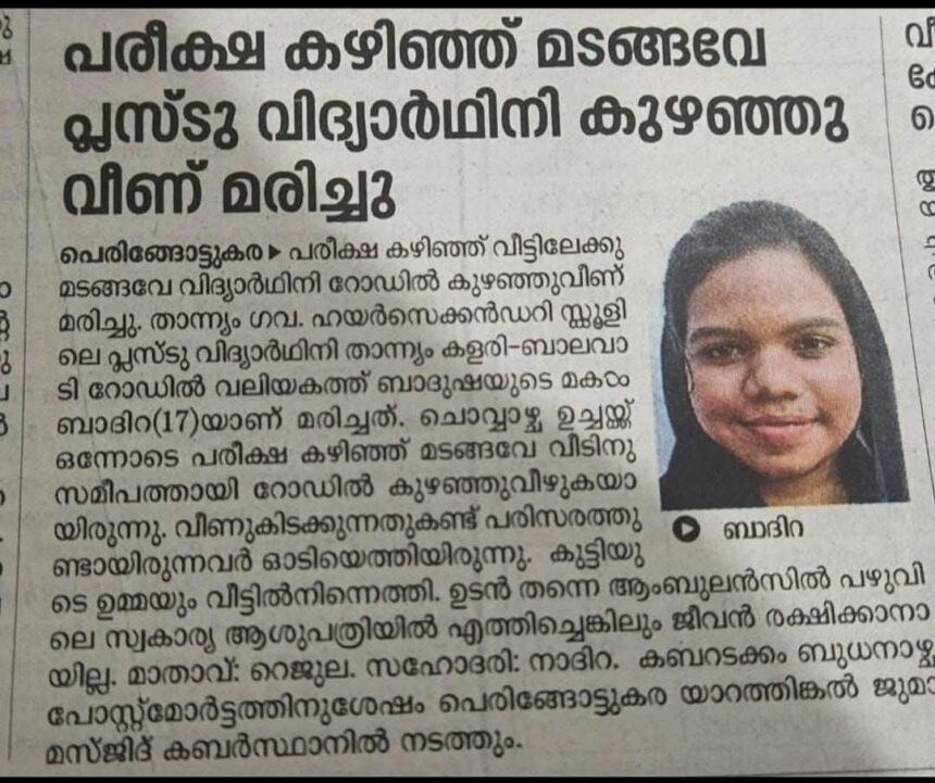 പരീക്ഷ കഴിഞ്ഞ് വീട്ടിലേക്ക് മടങ്ങവെ വിദ്യാര്ത്ഥിനി റോഡില് കുഴഞ്ഞുവീണ് മരിച്ചത് വിവാദമാവുന്നു. പെരിന്തല്മണ്ണ താന്ന്യം ഗവണ്മെന്റ് ഹയര്സെക്കന്ഡറി സ്കൂളിലെ പ്ലസ്ടു വിദ്യാര്ത്ഥിനി, ബാദിറ എന്ന 17കാരിയാണ് മരിച്ചത്. ചൊവ്വാഴ്ച ഉച്ചയോടെ വീടിന് സമീപത്ത്വെച്ചാണ് മരണം. വീണുകിടക്കുന്നത് കണ്ട് നാട്ടുകാര് ഓടിവന്ന് ആശുപത്രിയിലാക്കിങ്കെിലും രക്ഷിക്കാനായില്ല. ഈ വാര്ത്ത ഒരു സാധാരണ മരണമായാണ് കേരളത്തിലെ മാധ്യമങ്ങള് റിപ്പോര്ട്ട് ചെയ്തതെങ്കിലും എക്സ്മുസ്ലീം സംഘടനകളും, ഖുര്ആന് സുന്നത്ത് സൊസൈറ്റിയും, സ്വതന്ത്രചിന്തകരായ ഡോക്ടര്മാരും വിഷയം ഏറ്റെടുത്തിരിക്കയാണ്. ഇത് നോമ്പ് മൂലമാണെന്നാണ് അവര് ആരോപിക്കുന്നത്. ആരിഫ്ഹുസൈന് തെരുവത്തിനെപ്പോലുള്ള സ്വതന്ത്രചിന്തകര് ഈ വിഷയം വലിയതോതില് ചര്ച്ചയാക്കുന്നുണ്ട്.