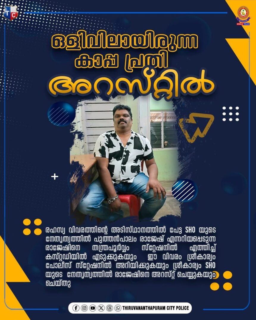 ഓപ്പറേഷൻ ഡാർക്ക് ഹണ്ടിന്റെ ഭാഗമായി സിറ്റി ഡെപ്യൂട്ടി പോലീസ് കമ്മീഷണർ തപോഷ് ബസുമതാരി IPS ൻ്റെ നിർദ്ദേശാനുസരണം, ശ്രീകാര്യം പോലീസ് പേട്ടയിലെത്തി പ്രതിയെ കസ്റ്റഡിയിലെടുക്കുകയായിരുന്നു. തിരുവനന്തപുരം സിറ്റിയിലെ വിവിധ സ്റ്റേഷനുകളിലായി 50 ഓളം കേസുകളിൽ പ്രതിയാണ് ഇയാൾ. അടുത്തിടെ വീണ്ടും ആക്രമണ കേസുകളിൽ പ്രതിയായതിനെ തുടർന്നാണ് ഇയാൾക്കെതിരെ കാപ്പ ചുമത്തിയത്.