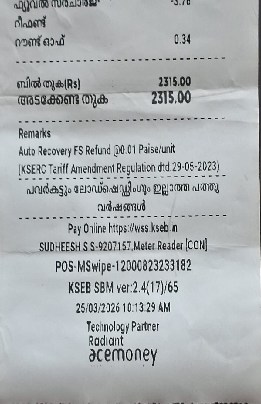 സംസ്ഥാന വൈദ്യുതി ബോർഡിൻറെ ഉപഭോക്താക്കൾക്ക് ഈ മാസം നൽകുന്ന വൈദ്യുതി ബില്ലിൽ അടക്കേണ്ട തുകയ്ക്ക് ചുവടെയായി ‘പവർകട്ടും ലോഡ് ഷെഡിങ്ങും ഇല്ലാത്ത 10 വർഷങ്ങൾ’ എന്ന വാചകമാണ് ബില്ലിൽ ചേർത്തിട്ടുള്ളത്.