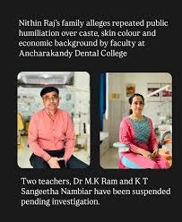 ഡോ. റാം സ്ഥിരം പ്രശ്നക്കാരനാണെന്നും ബോഡി ഷെയ്മിങ്ങും ഭീഷണിയും അധ്യാപകന്റെ ഭാഗത്തുനിന്ന് പതിവാണെന്നും വിദ്യാര്ഥികള് ആരോപിക്കുന്നു. ഡിപ്പാര്ട്ട്മെന്റ് മേധാവി ഡോ. എം.കെ. റാമിന്റെ പീഡനമാണ് നിതിനെ മരണത്തിലേക്ക് തള്ളിവീഴ്ത്തിയതെന്നും സഹപാഠികള് വെളിപ്പെടുത്തുന്നു. നിതിന്റെ ആത്മഹത്യയെ തുടര്ന്ന്, ഡോ സംഗീത, ഡോ റാം എന്നിവരെ കോളജ് സസ്പെന്ഡ് ചെയ്തിരിക്കയാണ്.